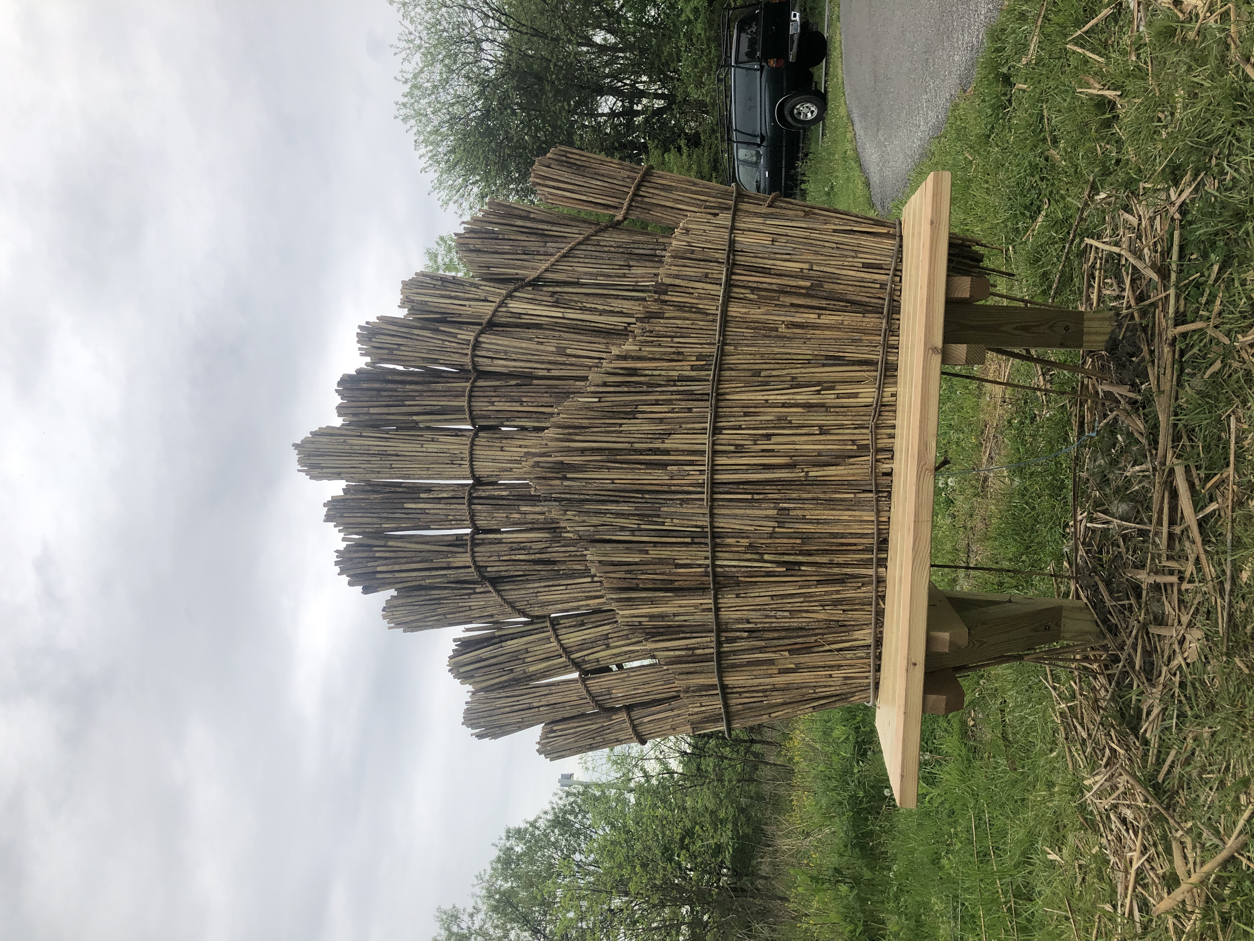 The benches were made with Phragmites reed, which is a prominent (yet unwanted) part of the landscape at the Refuge. Phragmites is native to Europe and the Middle East, with many traditional uses. The Phragmites that dominates many wetlands in the US today was likely introduced with European colonization, and followed disturbed ecosystems and transportation networks across the continent. The reed was harvested from the refuge by volunteers and the Mobilize Green youth crew, and the harvests contributed to habitat restoration efforts. The youth crew also helped to build the benches.