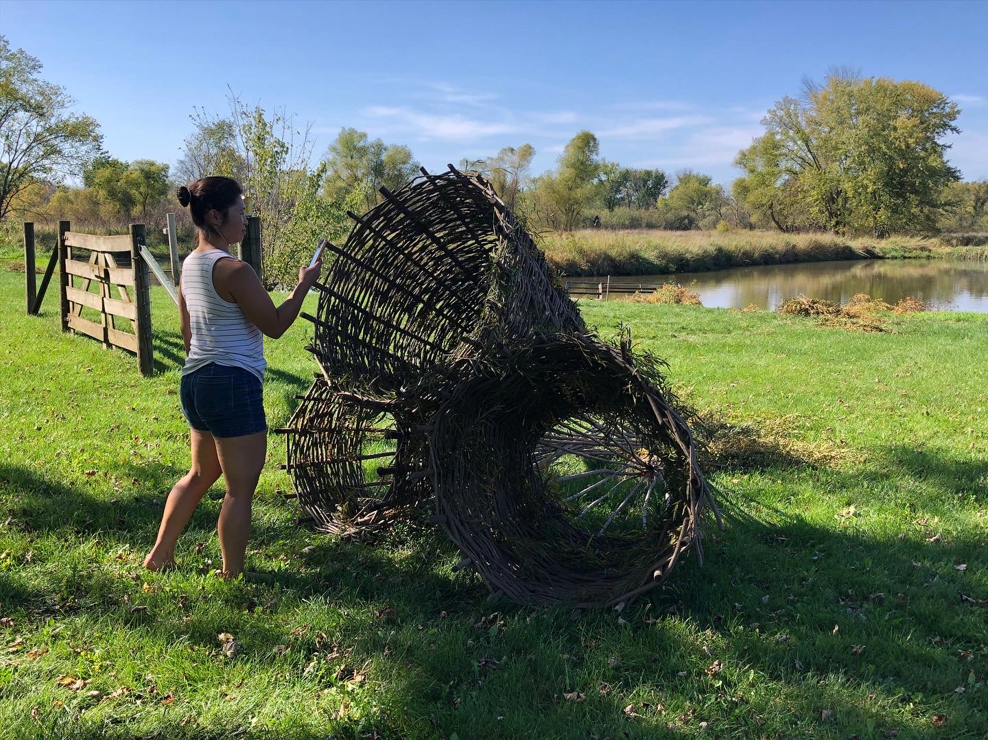 I was also interested in a dialogue between different materials - the braided “invasive” reed canary grass and the woven native willow - as a way to prompt viewers to think about things wanted and unwanted in the landscape. The willow is staked into the earth and hopefully will take root and grow along the creek, preventing erosion. Although the reed canary grass is a pale substitute for the native wetlands and prairie that used to exist in the area, it also has beauty and ecological value.